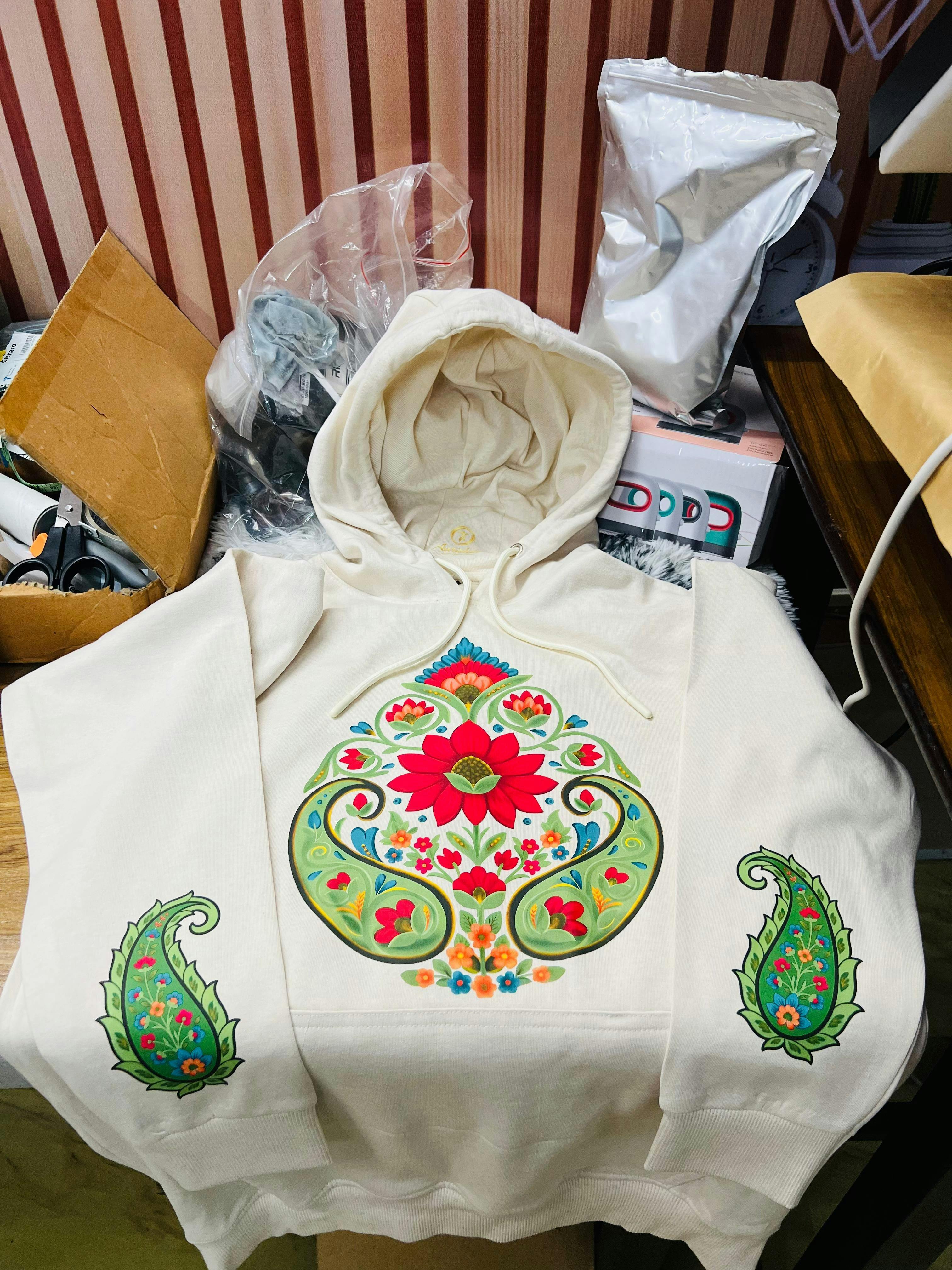 The highly ornate design is a masterpiece of traditional Indian decorative art, where every element conveys deep spiritual significance. The central Lotus (Kamal) is not merely a flower, but the seat of Goddess Lakshmi (goddess of wealth and prosperity) and a symbol of Lord Brahma (the Creator); it represents the absolute highest form of Purity, Creation, and Spiritual Perfection (Sahasrara Chakra). The flanking Paisley (Kairi/Ambi) motifs, signifying the mango fruit, are linked to fertility, immortality, and abundance, being a prominent feature in wedding garments and temple textiles. Thus, the design is a concentrated visual mantra, invoking blessings for spiritual transcendence, enduring beauty, and boundless material wealth through the harmony of divine and natural forms.