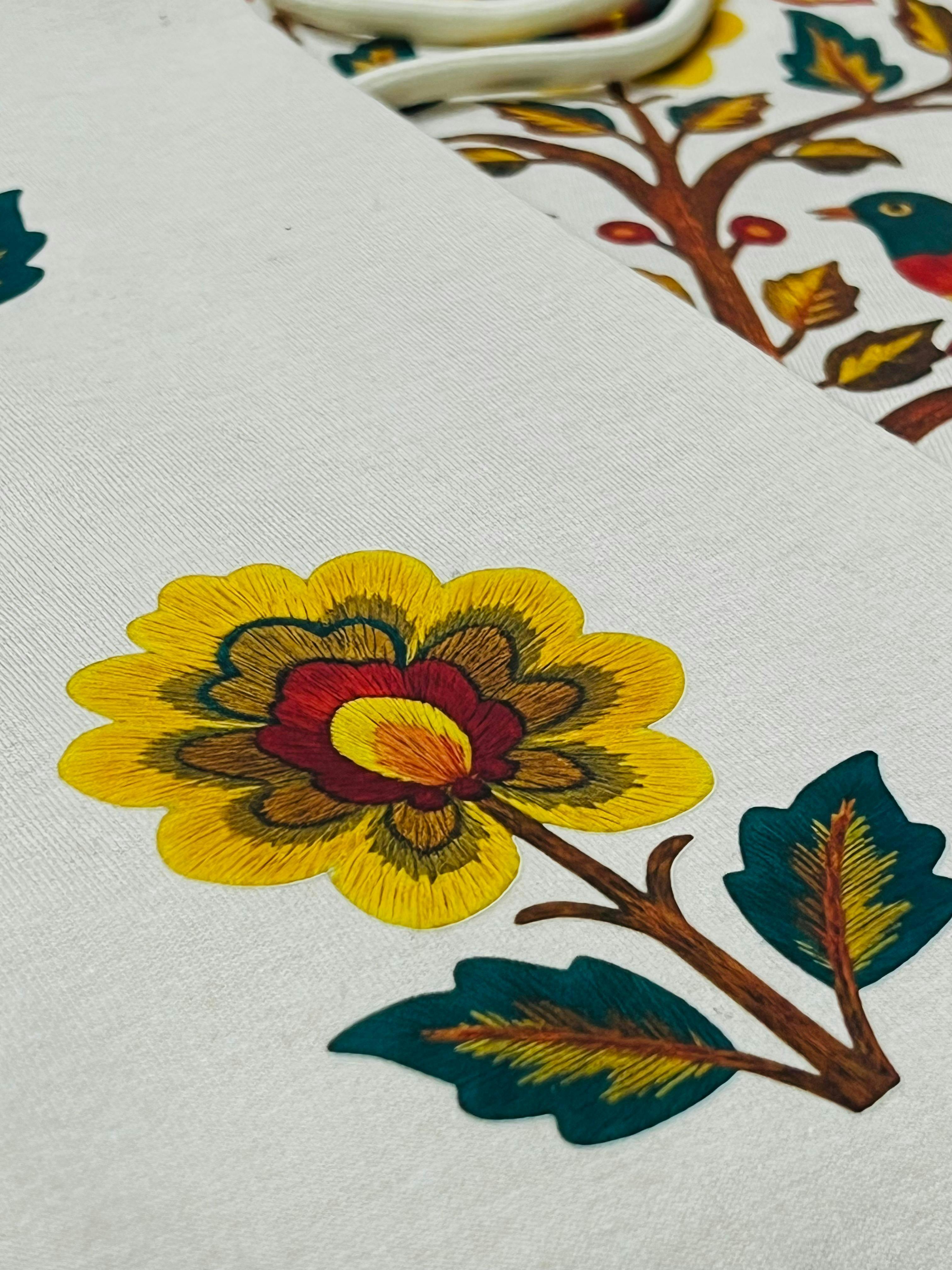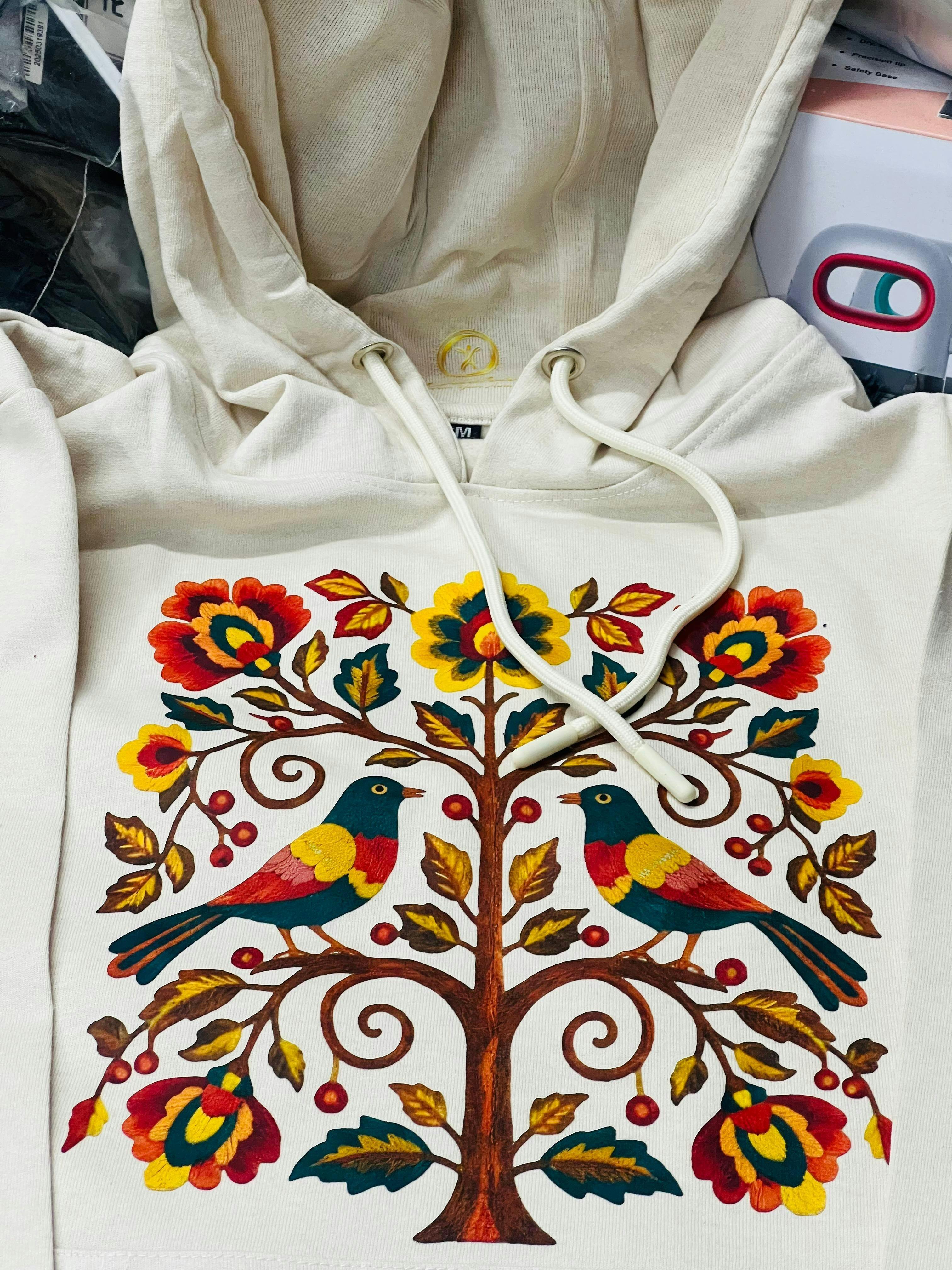 The design is centered on the Tree of Life, a powerful universal symbol representing the interconnectedness and balance of all existence, often signifying strong family roots, ancestry, and continuous renewal as its roots and branches link the physical and spiritual realms. This central motif is enhanced by two birds, symbolizing love and companionship, and vibrant sunflowers/floral elements on the sleeves, which represent joy, longevity, and vital, flourishing energy, culminating in a visual celebration of abundant life, harmony, and enduring growth